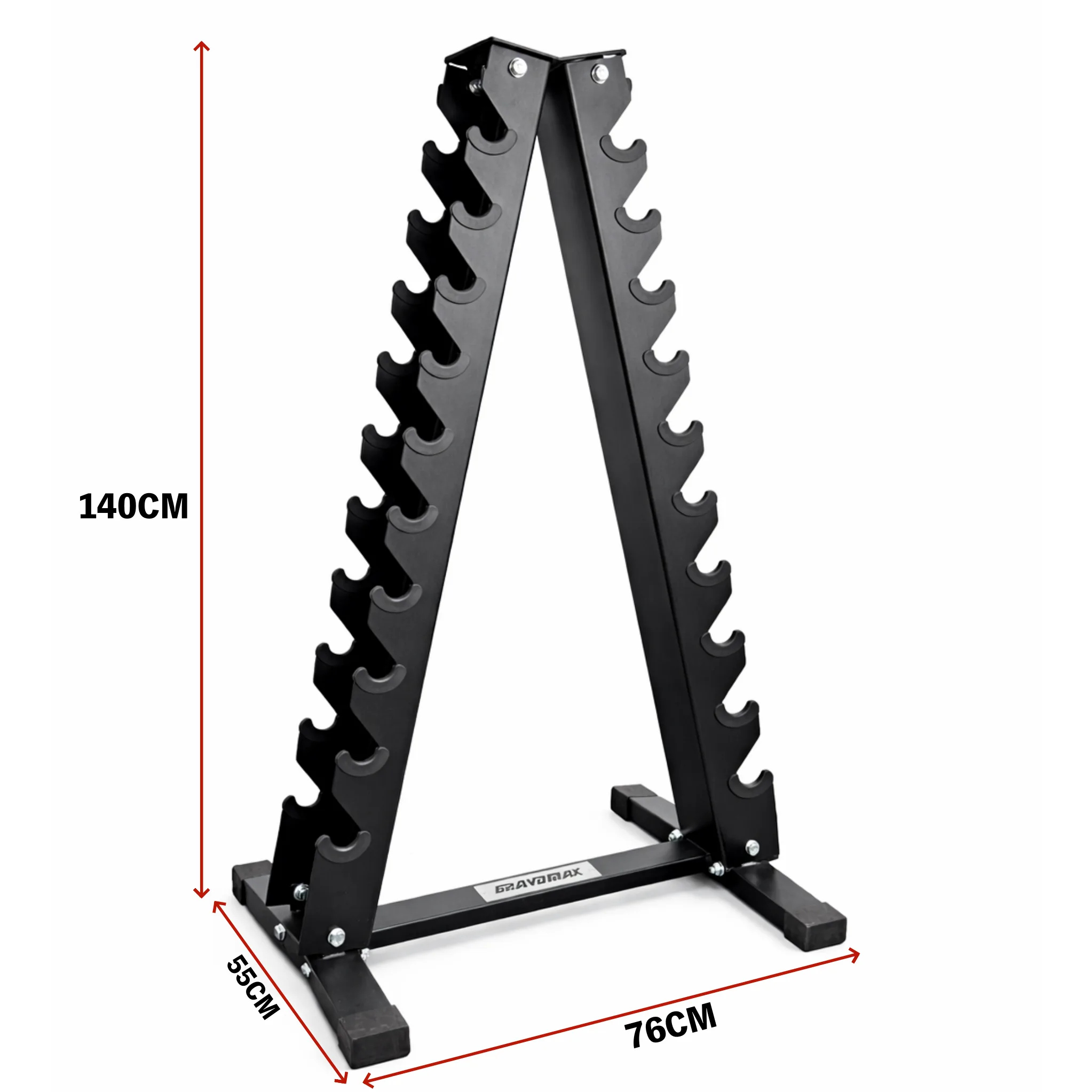 The GravoMax 10 Pair Dumbbell Stand is built to keep larger dumbbell sets organised without taking up unnecessary floor space. Its upright A-frame structure allows for easy access to weights while maintaining stability and order in busy gyms.