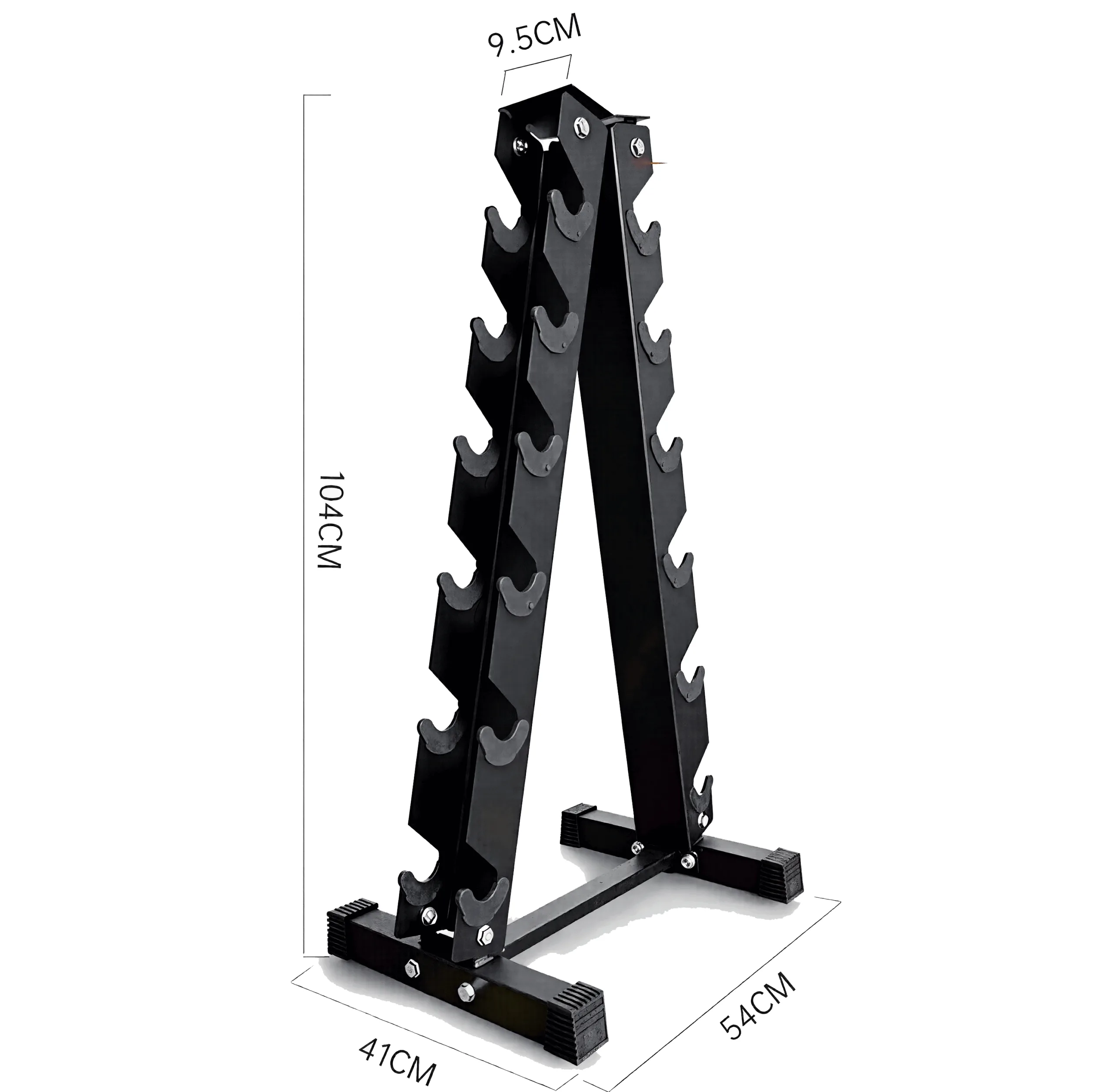 The 6 Pair Dumbbell Stand is built for athletes and gym owners who want a durable, space-saving solution. With its triangular A-frame design and reinforced steel structure, it keeps dumbbells secure while minimising floor space usage.