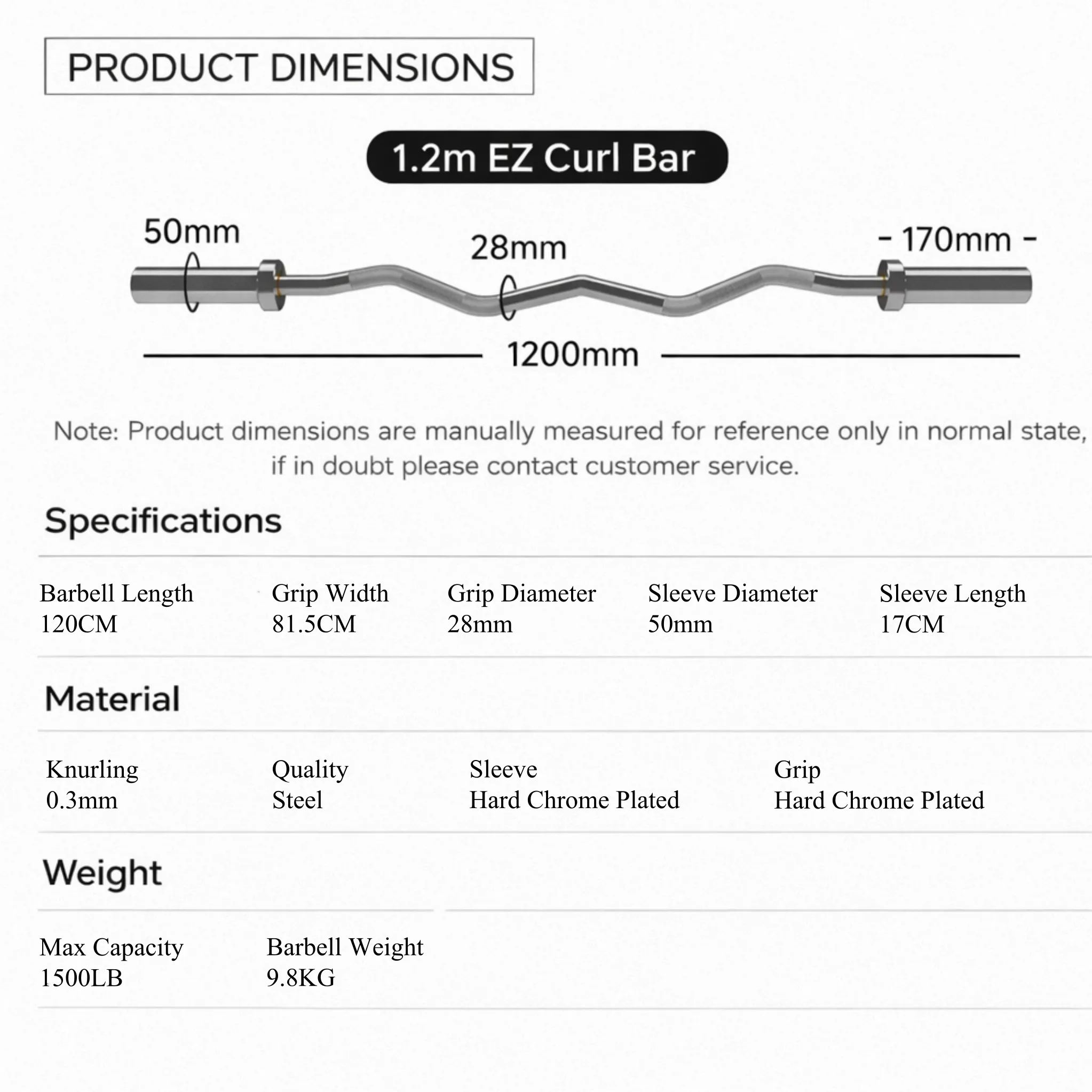 Train smarter with the GravoMax Olympic Curl Barbell 1.2m. Its ergonomic design supports wrist alignment and comfort during curls, rows, and extensions — built from solid steel with a durable chrome finish.