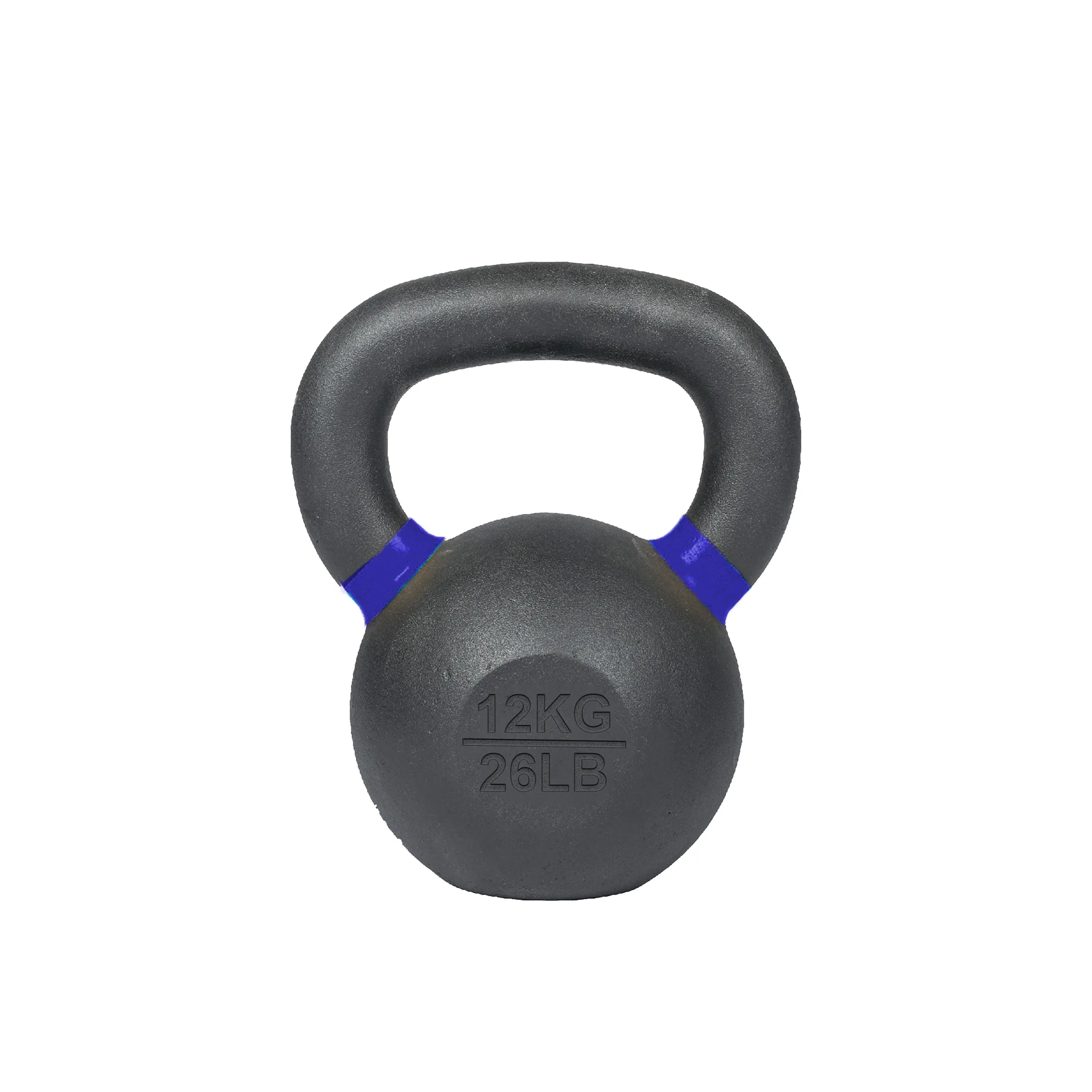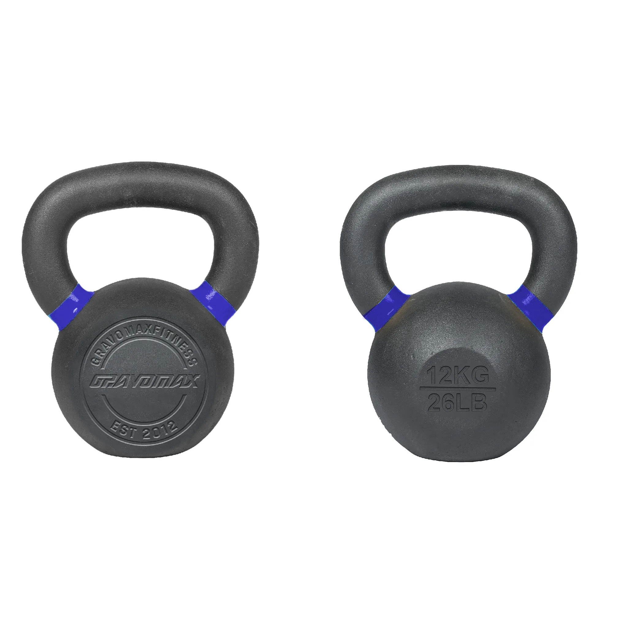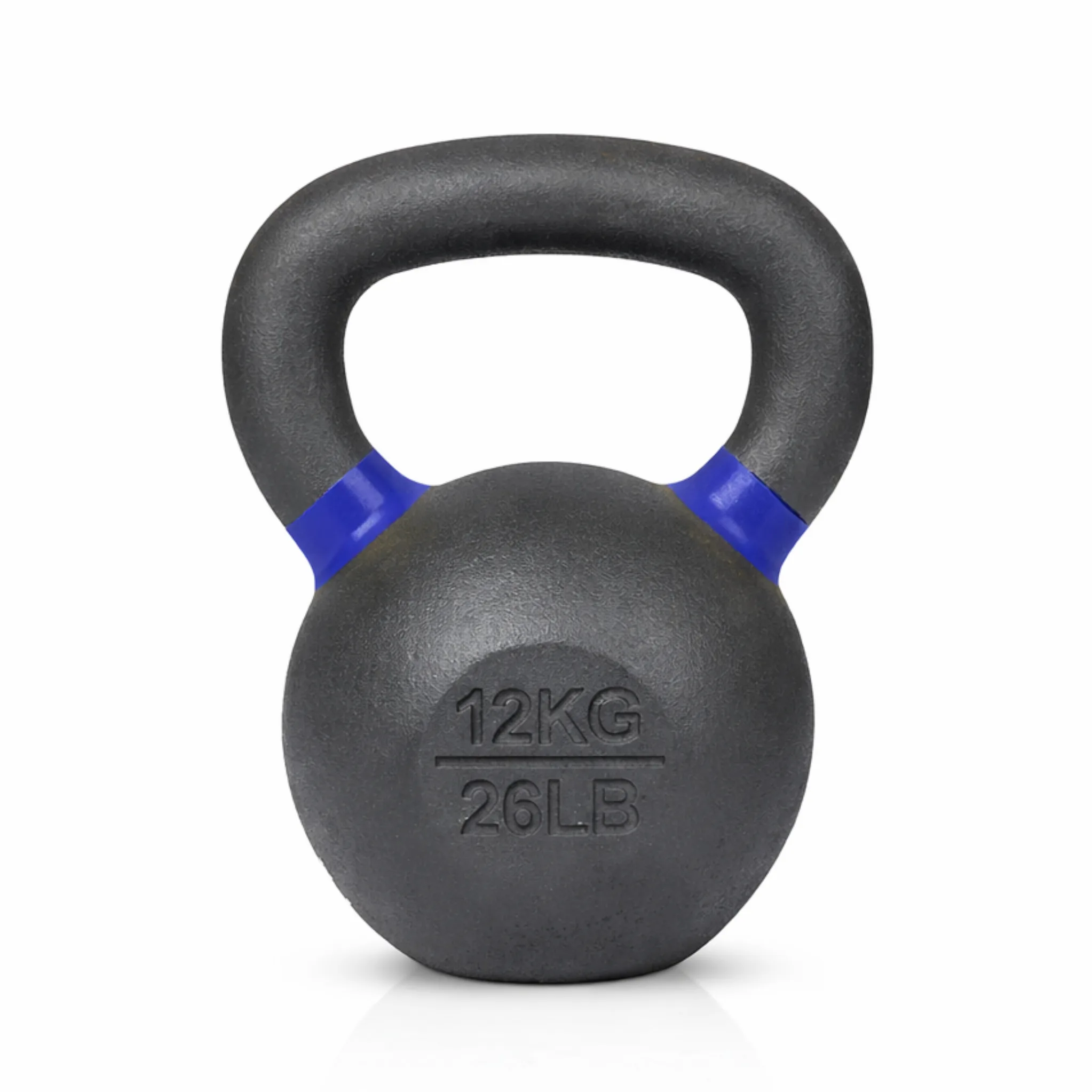 Solid 12KG cast-iron kettlebell with matte powder coating, dual KG/LB markings, and color-coded ring. Built for control, balance, and reliable grip during strength and endurance sessions.