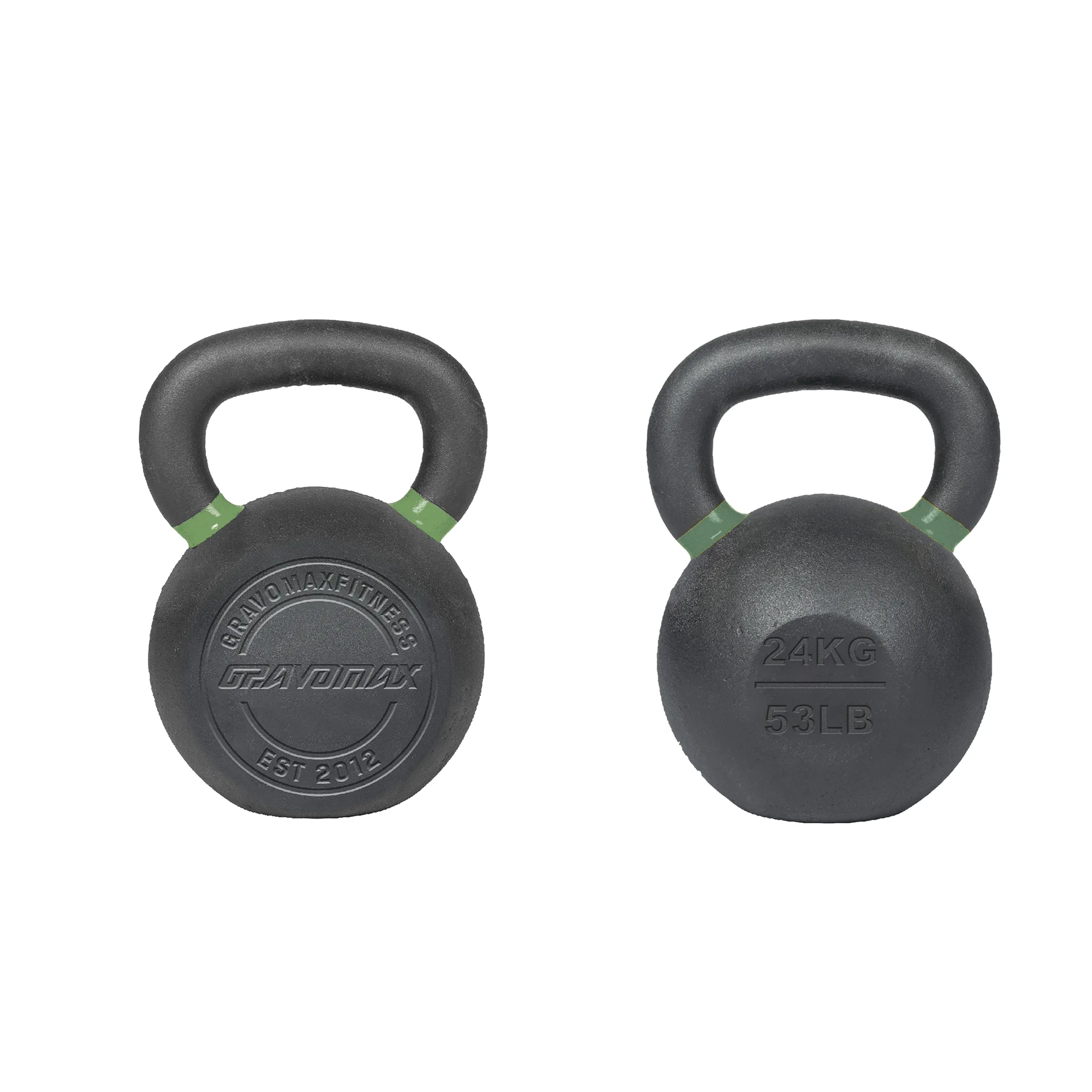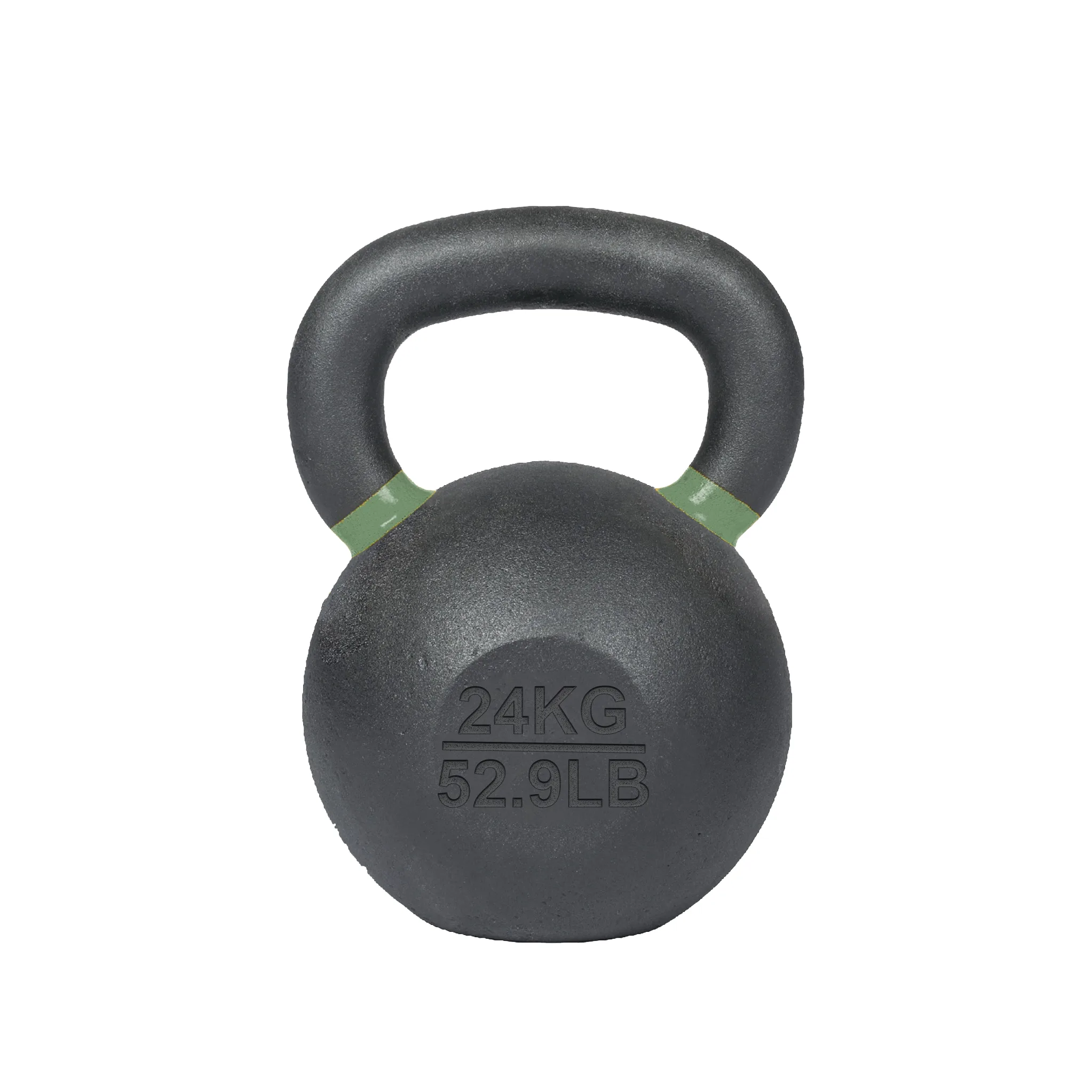 24KG solid cast-iron kettlebell with matte coating, color ID ring, and dual markings.
