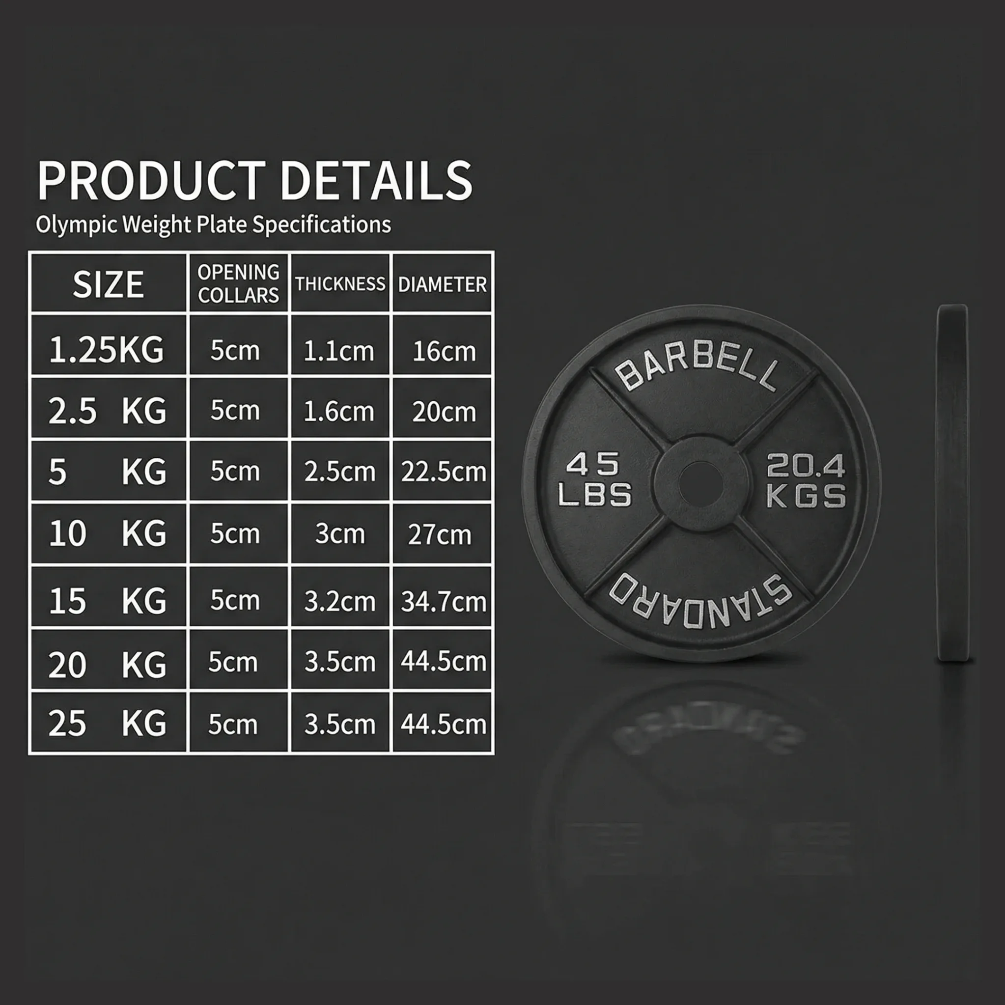 - Collar Opening: 50mm (Fits all standard Olympic barbells)