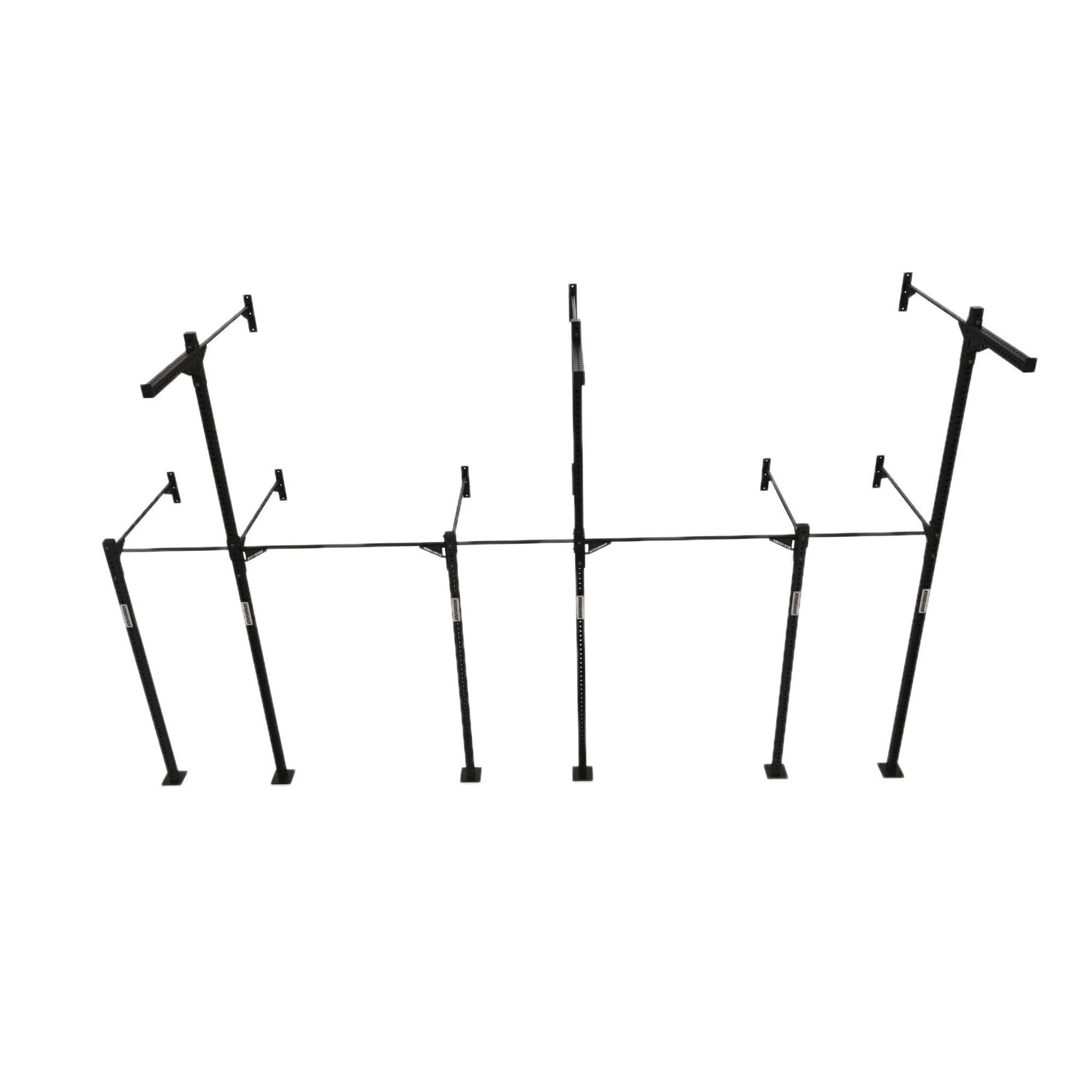 Each bay is supported by uprights built from 75 × 75 mm steel with 3 mm walls. The mast design pairs tall 4.5 m posts for ropes and rings with standard uprights for barbell and bodyweight work. Precision laser-cut holes make attachment changes quick, while the matte black powder coat protects the frame and maintains a sharp professional look.