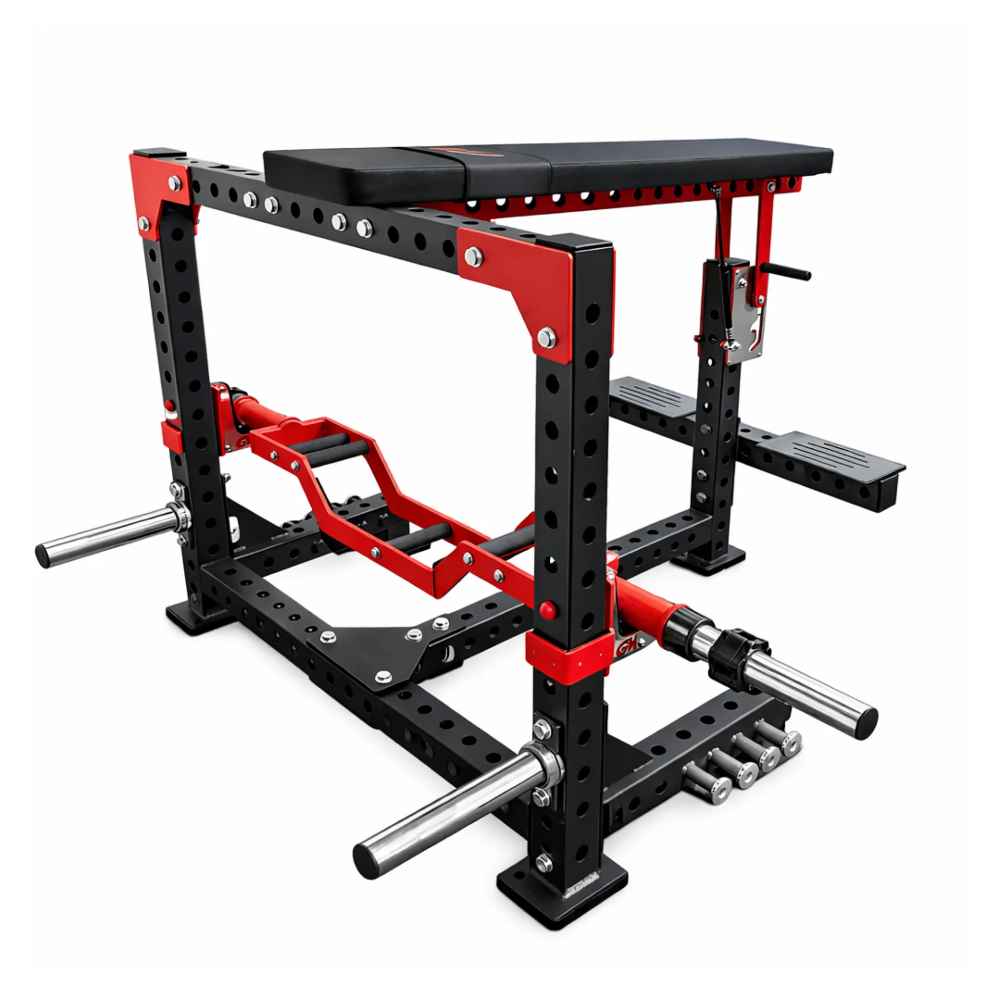 Equipped with textured foot platforms for secure positioning and adjustable support brackets for smooth barbell setup and re-rack. - Multi Grip Row Bar Included
