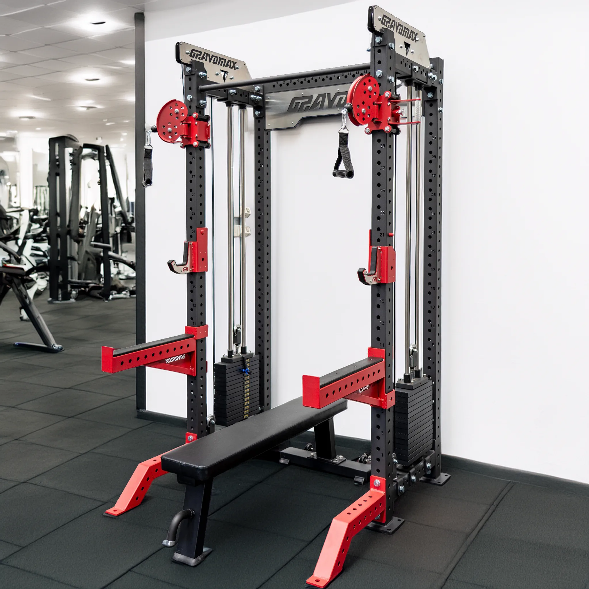 The GravoMax GM200 combines the stability of a squat rack with the versatility of a dual adjustable cable trainer. In one compact frame, it supports barbell squats, presses, and pull-ups, while also unlocking a wide range of cable-based movements for accessories and functional training. Built for athletes, coaches, and high-performance gyms, GM200 is a clean, professional foundation for strength work and everyday programming.