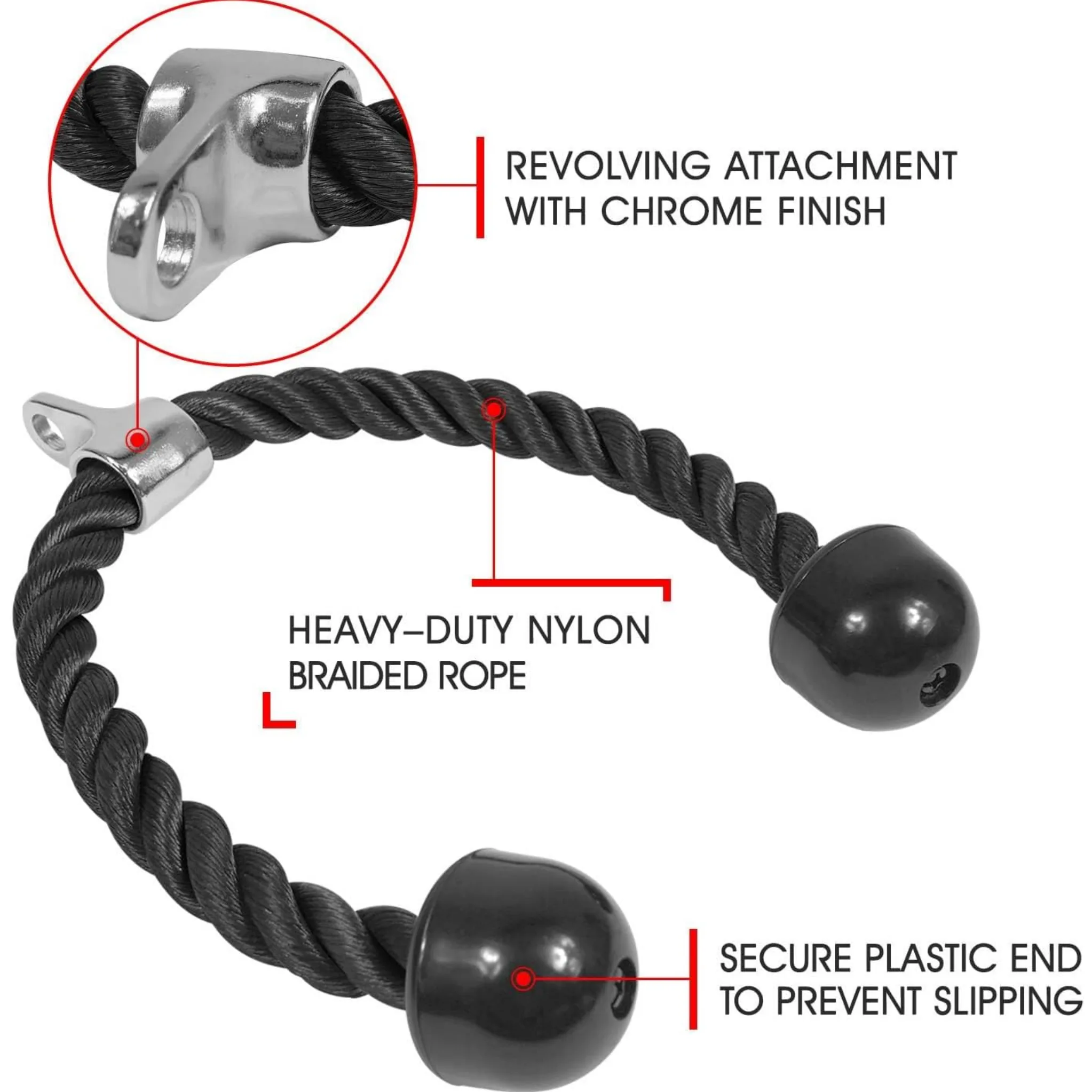 Durable tricep rope with heavy-duty nylon construction and rubber grip ends.